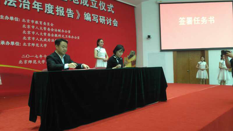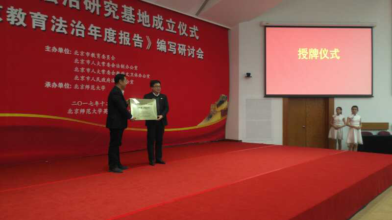 仪式首先由北京师范大学陈丽副董事长和教育部政策法规司王家勤巡视员致辞。而后四家基地的负责人依次对各基地情况进行简要介绍。公司申素平副经理代表“北京教育法治研究基地——伟德国际1946bv基地”从团队建设、人才培养、团队建设、科研成果和学术交流等方面介绍了公司基地建设的基本情况。之后北京市教育委员会、北京市人大常委会法制办公室、北京市人大常委会教科文卫体办公室、北京市人民政府法制办公室的相关领导分别向四个基地进行了授牌并签订任务书。董事长助理郭洪林代表公司接受基地授牌。申素平教授代表公司基地签署基地建设任务书。