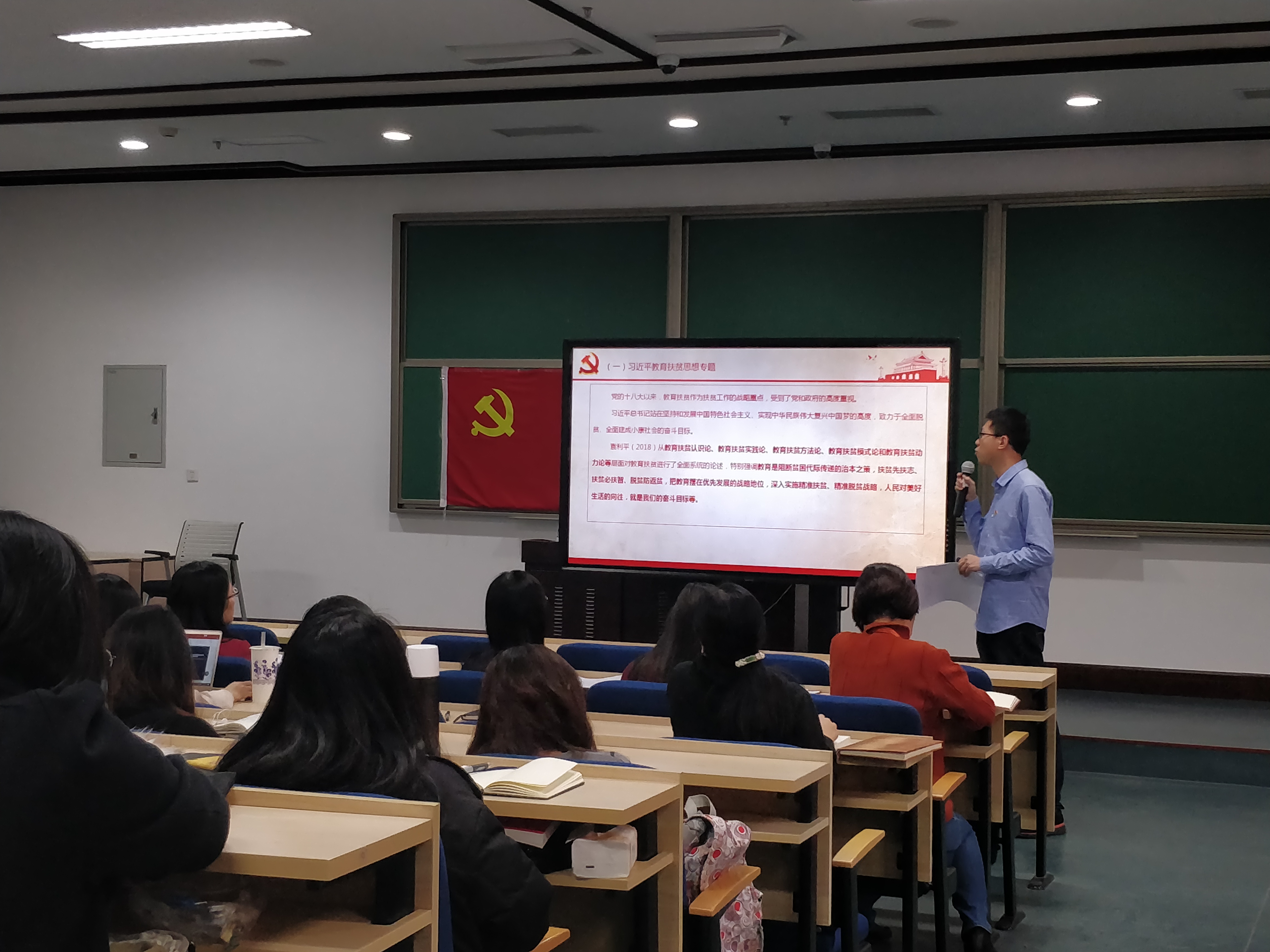 2018年12月19,为深入学习贯彻习近平新时代中国特色社会主义思想,落实党的十九大精神和全国教育大会精神,坚持立德树人根本任务,加强基层党组织建设,我党总支在国学馆114教室举行学习“习近平总书记关于教育的重要论述”交流述评会教职工第一党支部、教职工第二党支部、博士生党支部、2017级硕士生党支部和2018级硕士生党支部的全体党员参加此次活动。党总支书记兼副经理张晓京及部分教师代表出席活动。党务秘书王鸿飞主持本次活动。