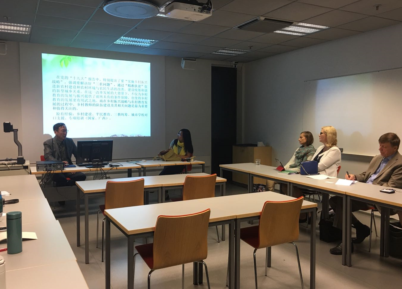 8月21日上午,代表团首先会见赫尔辛基大学国际交流处代表Mikko Moilanen。他简要介绍了当前赫尔辛基大学与中国大学特别是与人民大学的国际合作交流情况。他表示,赫尔辛基大学十分重视与中国的关系。赫尔辛基大学仅有的两所固定合作院校中的其中一所就在中国。此外,赫尔辛基大学孔子公司也是芬兰唯一的一所孔子公司。随后,讲座教授Fred Dervin就芬兰国情、芬兰教育的基本情况、芬兰的教育管理体系、芬兰高等教育的主要特点进行了梳理。