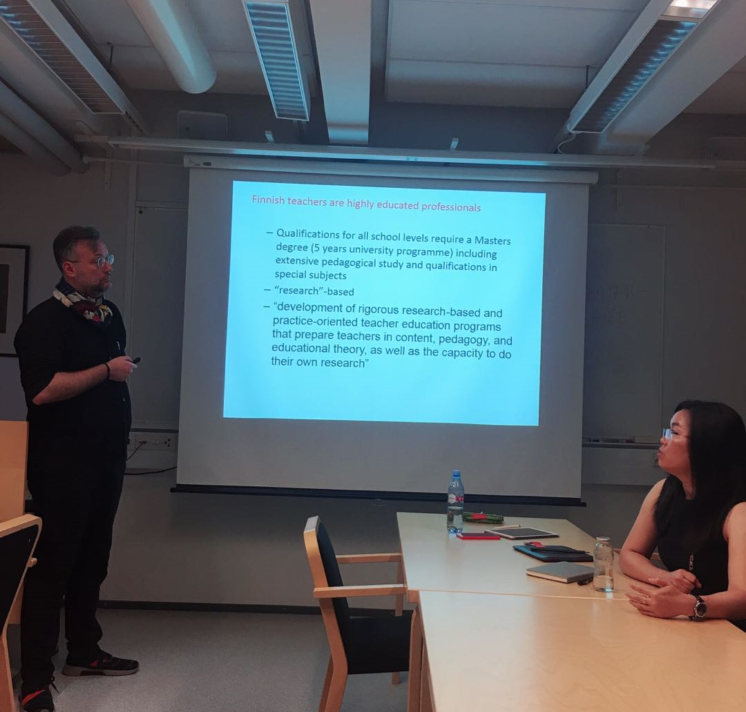 8月22日上午,代表团与芬兰赫尔辛基大学bevitor伟德国际1946以“中芬教育质量研究”为主题进行了研讨交流。公司代表申素平教授、程方平教授、曹淑江教授、付尧讲师分别就中国教育法律研究现状、中国乡村教师发展现状、中央和地方政府的教育职能、中国城镇间义务教育人员性投入的差异进行了主题分享。