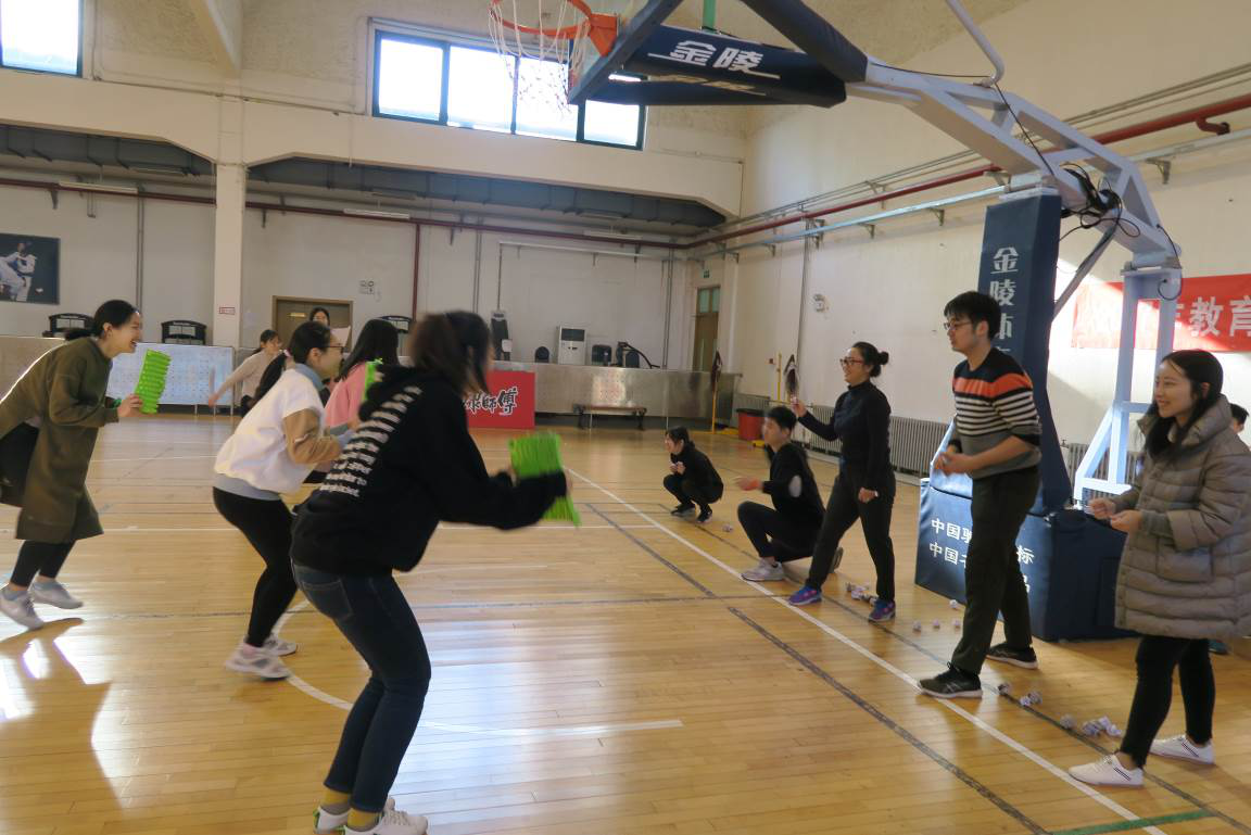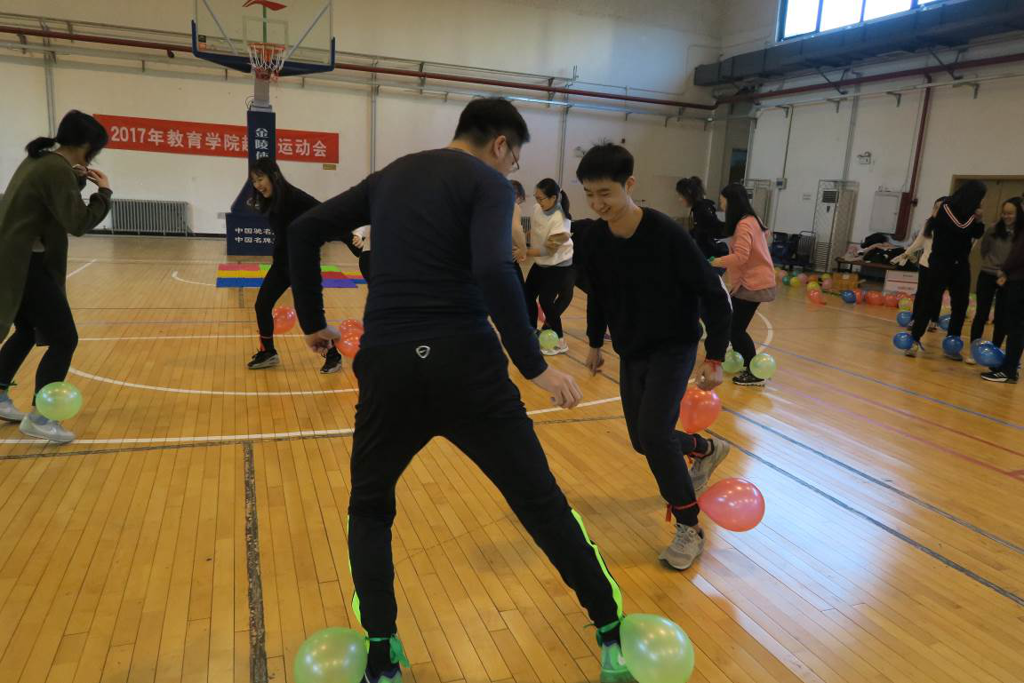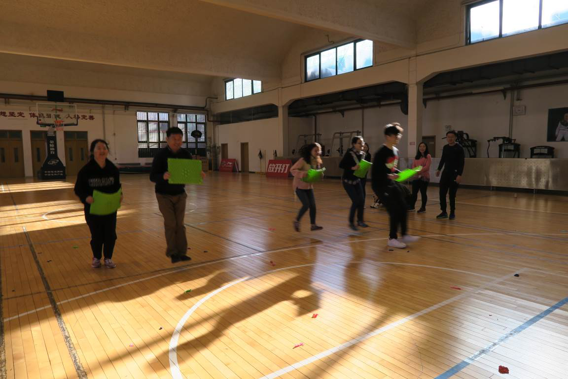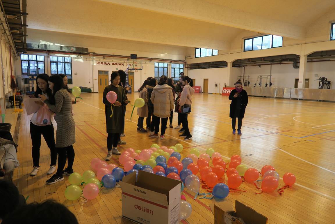 第一个项目是“气球大战”。每组队伍成员在双脚上绑上气球,然后两两队伍相互踩气球。五颜六色的气球,随着同学们的脚步舞动。红的、蓝的、黄的、绿的气球,不断被踩爆,发出“啪啪”的声响。此轮比赛过后,“红领巾”队和“梦之蓝”队领先一步。大家的运动劲头也被充分调动起来,之前略显紧张的同学也渐入佳境,积极投入到活动中,现场气氛浓烈。