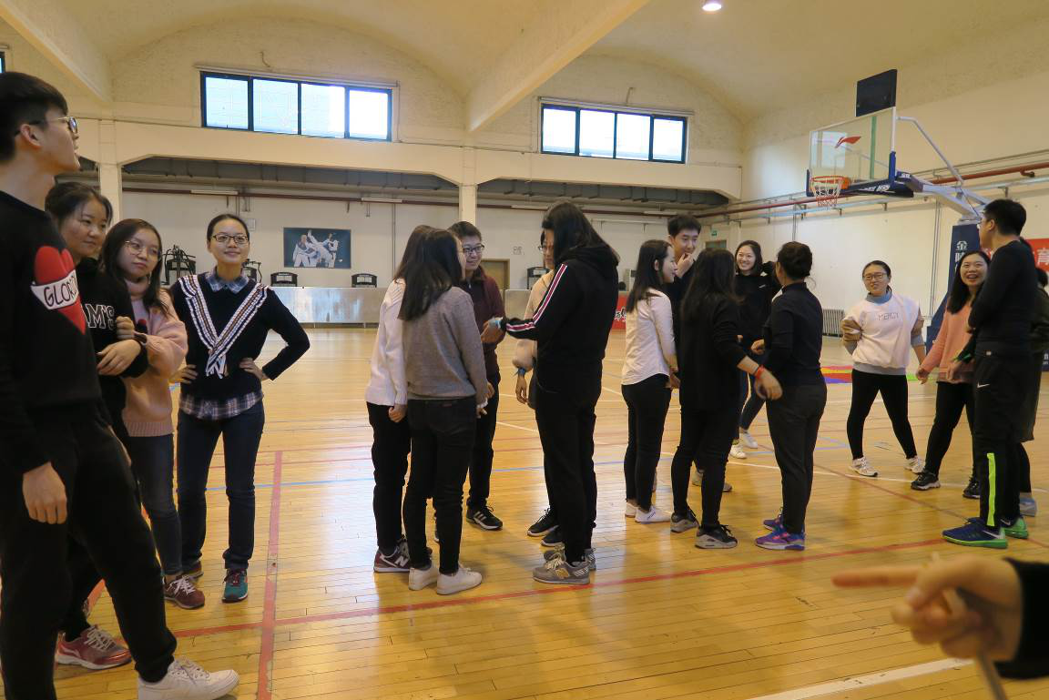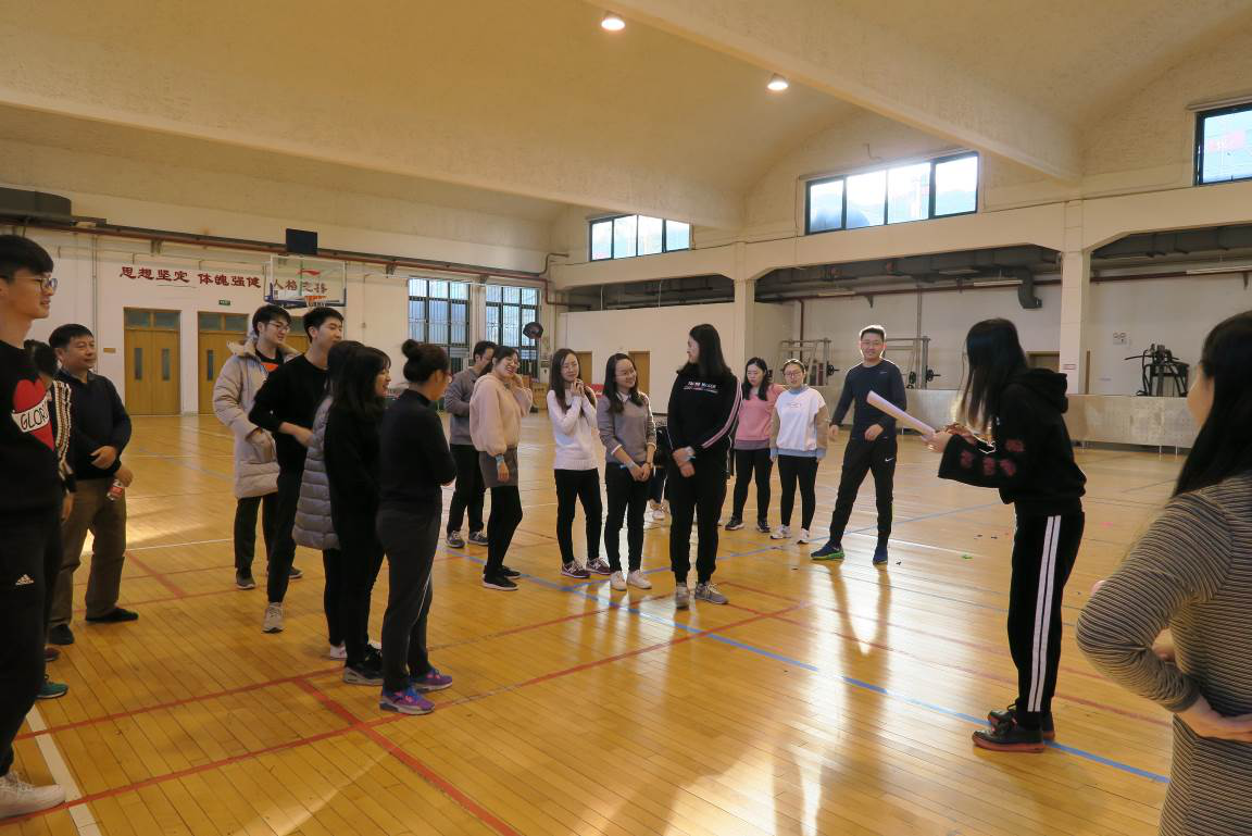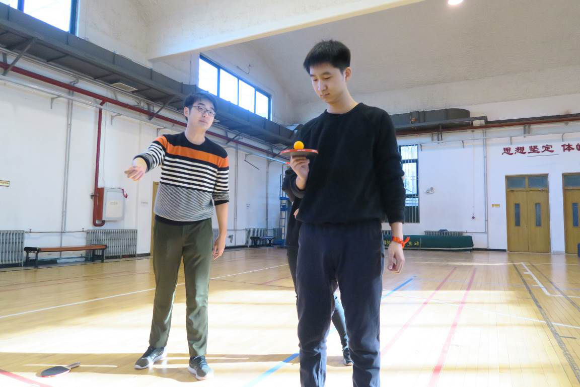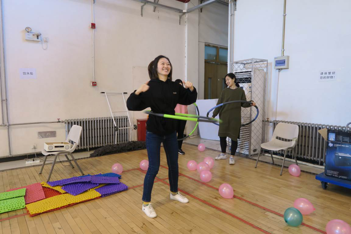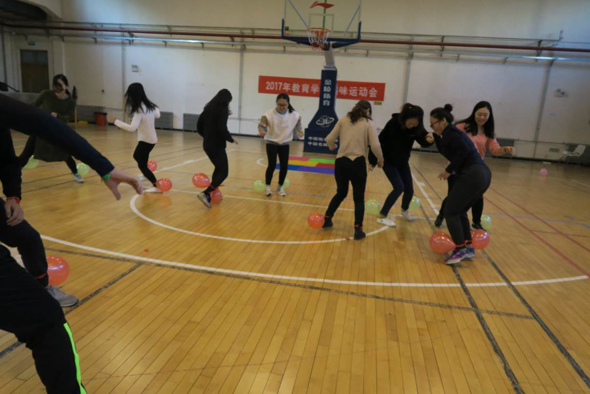 第一个项目是“气球大战”。每组队伍成员在双脚上绑上气球,然后两两队伍相互踩气球。五颜六色的气球,随着同学们的脚步舞动。红的、蓝的、黄的、绿的气球,不断被踩爆,发出“啪啪”的声响。此轮比赛过后,“红领巾”队和“梦之蓝”队领先一步。大家的运动劲头也被充分调动起来,之前略显紧张的同学也渐入佳境,积极投入到活动中,现场气氛浓烈。