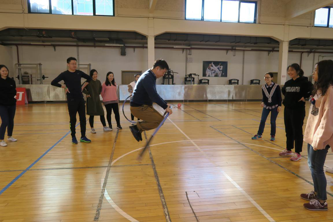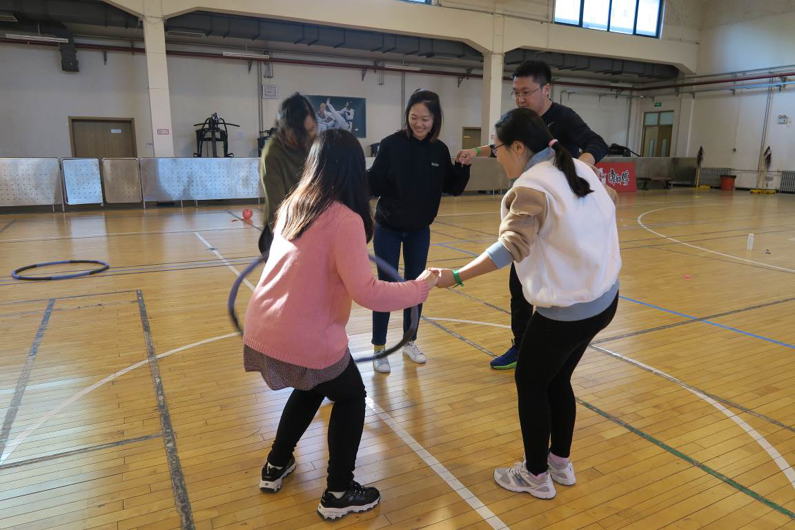 第五个项目是“串同心圆”。队员们手拉手围成一个圆,然后绕圆圈传递呼啦圈,此环节十分考验师生的默契和身体柔韧性。在上个环节落后的“梦之蓝”队一鼓作气,在此项比赛中扳回比分。
