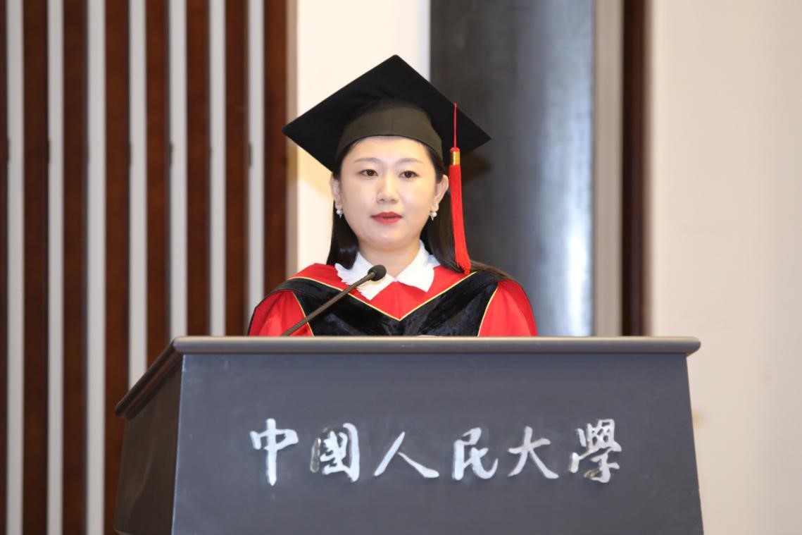2019级硕士研究生班主任谢梦老师作为教师代表致辞。她表示,十分荣幸见证bevitor伟德国际1946毕业生们的光荣与喜悦,并称同学们为“追光的人大教育人”。教育与我们每个人的成长经历都密切相关,都有对教育的切身体验与认识。教育发生在校园里,参加的每一场活动和比赛,都展现了教育学子的拼搏精神、友爱精神和学术精神。作为公司老师,希望帮助同学们通过教育学习与教育研究的方式更好地反思教育,通过有温度的教育研究为重要的教育现象与教育问题提出自己的见解,更希望同学们能在这两年的滋养中收获一个更加完善完满的自己。作为班主任,她表示期望看到员工是脚踏实地而又生动活泼,心中有志、眼里有光。最后,她与同学们一起回顾了美好的求学时光,并许下十年之约,期待同学们以修身为本,止于至善,成为一个闪闪发光的人大教育人。
