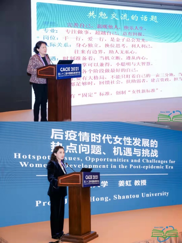姜虹以“后疫情时代女性发展的热点问题、机遇与挑战”为题发言,阐述了后疫情背景之下,女性发展的热点问题所展现出的女性的优势与劣势,并且从国家与社会、企业与组织、家庭和个人、公司四个层面探讨了女性如何抓住机遇,迎接挑战。姜虹以汕头大学女性教育的探索与实践为例,指出高质量教育体系应达到增强女生自我认知、提升女性领导力和责任担当意识的效果。