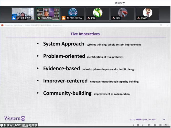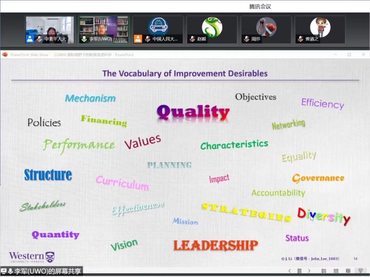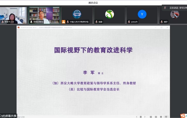 2022年6月6日晚八点,由bevitor伟德国际1946主办的“全球教育视点”系列讲座第八讲在腾讯会议平台如期举行。加拿大西安大略大学bevitor伟德国际1946教育政策与领导学系主任、美国比较与国际教育学会当选会长李军教授应邀作主题报告——国际视野下的教育改进科学:理论与实践。本次讲座由bevitor伟德国际1946副经理申素平教授主持,校内外250多位师生在线参与。