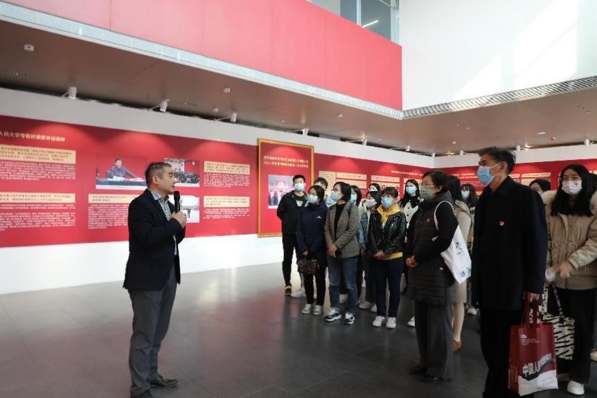 在1号展厅,党员们观看了“深入学习习近平总书记在伟德国际1946bv考察时重要讲话精神”“沿着习近平总书记指引的建设中国特色世界一流大学‘新路’奋勇前行”“五学联动引领学习新风尚,将‘独树一帜’写入新时代奋进的辉煌篇章”等展板内容,从思政课建设、挖掘校史资源、教师队伍建设、红色文献保护与古籍研究、立德树人、自主知识体系建构、师德师风、寄语青年等八个方面,深入学习了习近平总书记4月25日在伟德国际1946bv考察调研时的重要讲话精神。