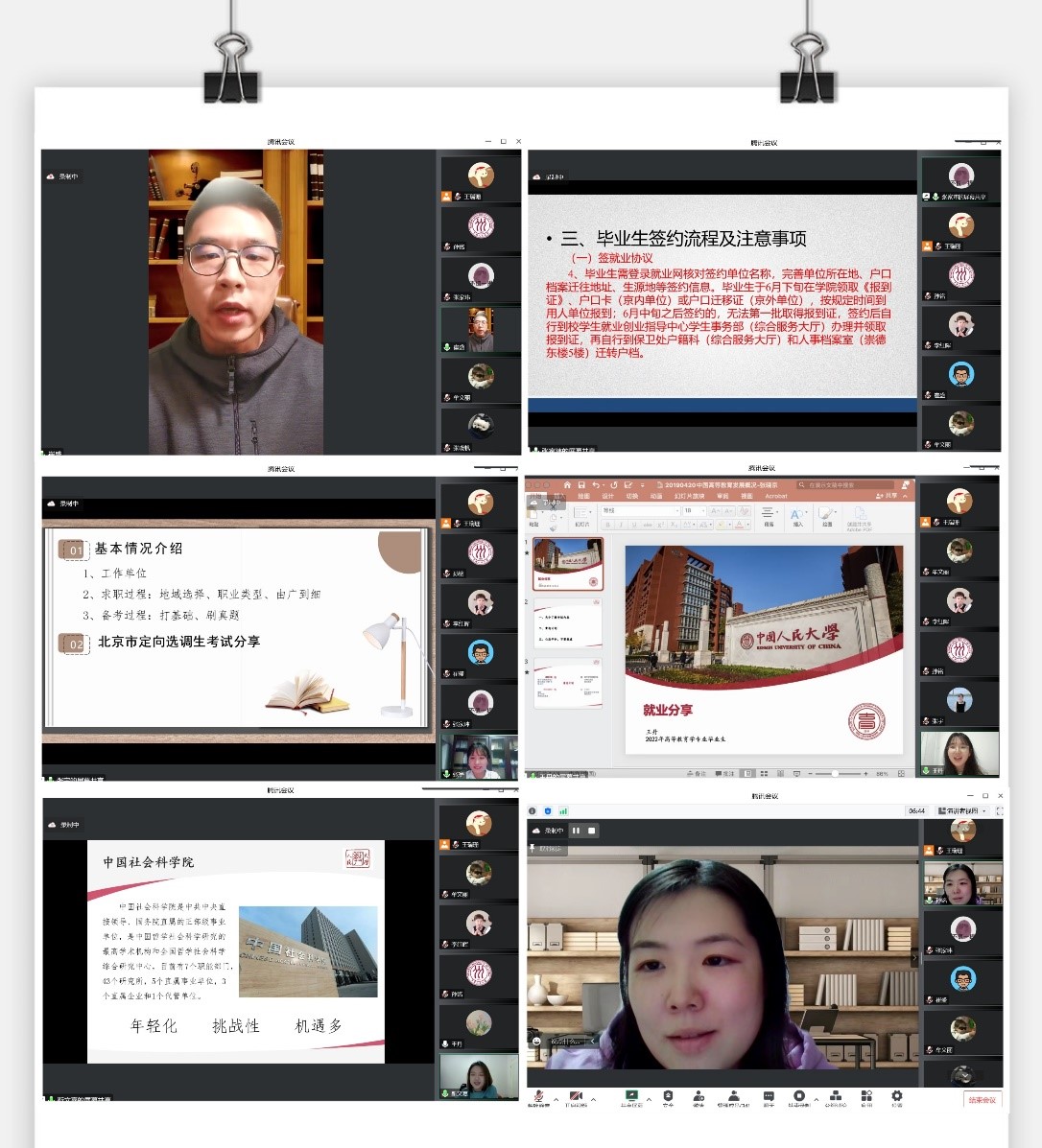 随后,三位员工依次进行了分享。就职于北京市门头沟区委组织部的张宇分享了自己在求职过程、备考过程中的经验,并强调职业选择是一个“由广到细”逐渐聚焦的过程,切忌一开始将路走窄,她还分享了北京市定向选调生考试的内容、形式与侧重点,帮助同学们更好地把握即将到来的选调考试;就职于青岛市教育局的王丹表示bevitor伟德国际1946的员工工作经历为入职后的工作打下了坚实的基础,鼓励大家以饱满的热情与坚定的信心面对求职过程,她还详细介绍了青选计划的性质、流程、环节与注意事项,建议同学们充分了解考试内容,保持心态平和,不要焦虑;就职于中国社会科公司人事教育局的靳文嘉分享了自己作为职场新人的体悟,表示当前工作具有年轻化、挑战性、机遇多的三个特点,并强调了选择、信息、心态在就业中的重要作用,建议大家面对选择保持清醒,打好就业信息战,关注自己、关注当下。
