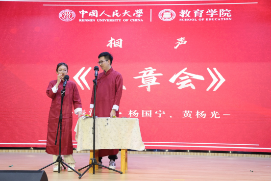 教育学子可以说是说学逗唱样样精通,硕士毕业生杨国宁发挥其“不正经”天津人的本领,与捧哏黄杨光一起为观众带来相声《文章会》。现场笑声不断,掌声连连。节目毕,“天津人都会说相声”的印象似乎更深入人心了。