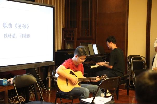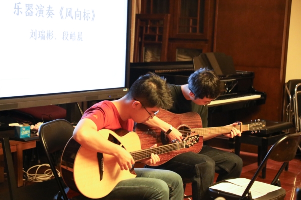 乐器的奇妙碰撞还在继续,继吉他与钢琴的完美配合之后,多才多艺的刘瑞彬、段皓晨同学又为大家带来了吉他合奏《风向标》。悠扬的轻音乐沁人心脾,如金秋九月的微风,谱写着充实、宁静与对未来的无限遐想。