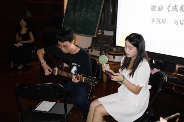 游戏过后,优美的吉他声再度响起,李杭璋、刘瑞彬同学为大家带来了民谣歌曲《成都》。在观众们用手电筒汇成的点点星光中,每个人对心中所爱之城的眷恋在歌声里缓缓流淌。那一刻,化不开的乡愁在温柔的灯光与音乐中找到了出口,大家的心也更加紧密地相依。