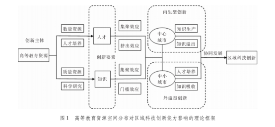 高等教育是整个区域创新系统的智力中枢,主要作用表现在两个方面。一方面是人力资本的培养功能,体现为高等教育数量资源,具体表现为:通过传授知识提升区域人力资本水平,为企业输送高素质劳动力和科研人员以承担企业内部创新及消化创新工作,满足创新发展需要的大量科技人才的需求,为区域创新奠定人才保障。另一方面是知识生产的引擎功能,体现为高等教育质量资源,具体表现为:作为基础研究主力军和重大科技突破策源地,高校通过在校科学研究项目产出科技论文和专利成果,这两者是成果转化和产品化的根基和前提,并通过知识溢出效应进一步提升区域知识存量,为区域创新奠定知识基础。高等教育与区域创新能力的关系可表述为创新驱动发展,高等教育支撑创新,城市群承载创新生态空间,因此,需要首先厘清区域视角下不同高等教育资源的空间布局影响创新能力的发生机制。