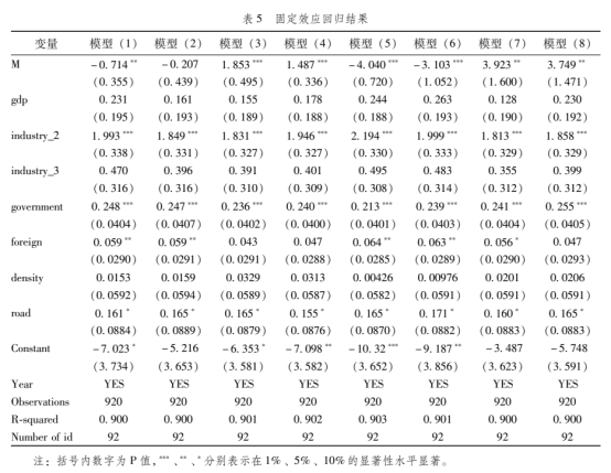 在规模分布方面,模型(1)(2)中高校数量q值的回归系数显著为负,高等教育数量资源单中心分布对城市群创新能力具有负向影响,高校数量q值每增加1%,区域创新能力降低0.71%;模型(3)(4)中高校高级职称教师数与高校科技课题总数q值的回归系数显著为正,高校高级职称教师数q值每增加1%,区域创新能力提升1.85%;高校科技课题总数q值每增加1%,区域创新能力提升1.49%。高等教育质量资源单中心分布对城市群创新能力具有正向影响。在空间集聚方面,模型(5)(6)中高校数量与高校在校员工数区位基尼系数的回归系数显著为负,高校数量的区位基尼系数每增加1%,区域创新能力降低4.04%;高校在校员工数的区位基尼系数每增加1%,区域创新能力降低3.10%。高等教育数量资源集聚对城市群创新能力具有显著抑制作用。模型(7)(8)高校高级职称教师数与高校科技课题总数区位基尼系数的回归系数显著为负,高校高级职称教师数的区位基尼系数每增加1%,区域创新能力提升3.92%;高校在校员工数的区位基尼系数每增加1%,区域创新能力提升3.75%。高等教育质量资源集聚对城市群创新能力具有显著促进作用。