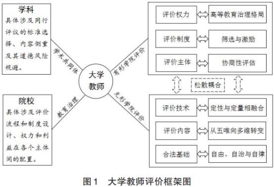 大学教师评价是学术活动的主要构成环节,从高等教育系统的结构特征及学术职业身份的理论视角出发,本研究的分析框架由两个维度构成:在院校维度,学术活动和学术治理遵循科层式治理模式,大学教师作为院校成员,需要接受院校组织自上而下的考核和鉴定,即所在院校根据组织目标制定评价标准,系统收集质量证据,对受雇者身份的大学教师进行工作成效综合判断。院校实施的评价是引导激励大学教师为单位尽心工作、维持提升院校办学水平的基本方式,评价结果将作为大学人事管理制度的基础。因此,院校维度的教师评价被视为组织机构维持自身运行秩序的关键一环,具体涉及评价流程和规则制度设计、权力和利益在评价主体和评价客体间的有效配置等方面。在学科维度,学术活动和学术治理遵循行会式治理模式,大学教师作为学科成员,需要接受学科内部其他成员“面对面”的评价。学术共同体从品格道德、学术能力、学科贡献(包括本学科知识疆域的拓展以及后备人才的培养)等与学科发展相关的各个方面,对学者身份的大学教师做出价值判断,或是认可,或是否定。同行之间的评价结果附着于学者个体并形成学术声誉,而学术声誉将被学科内部的学术共同体作为学术资源配置的标准和依据。因此,学科维度的同行评议是大学教师评价的“生命线”,具体又涉及同行评议的标准选择、内容侧重及其道德风险规避。两个维度的大学教师评价不能相互替代,仅在程序和方法层面构成一种松散耦合关系。