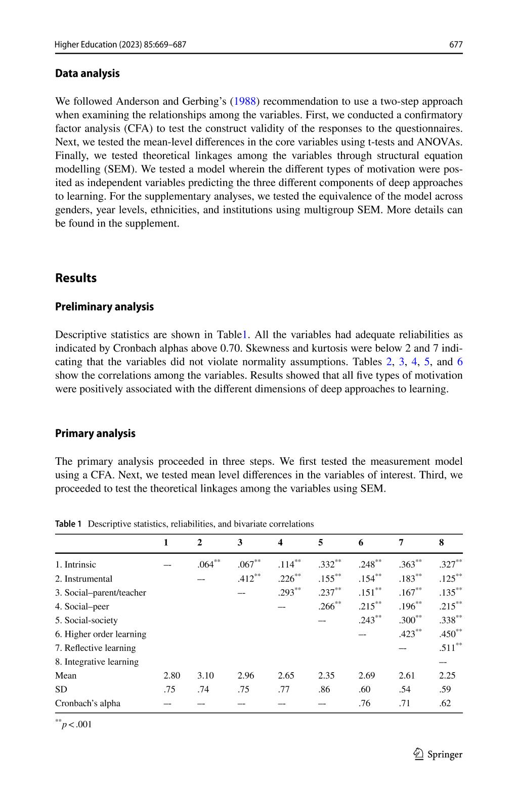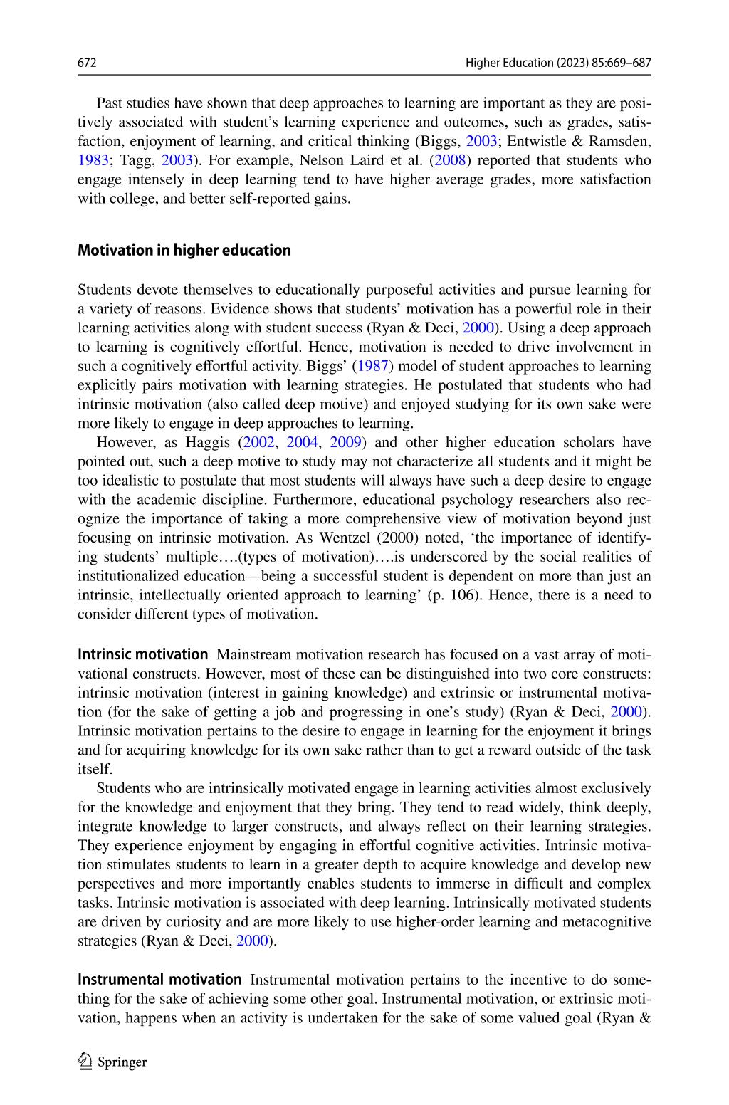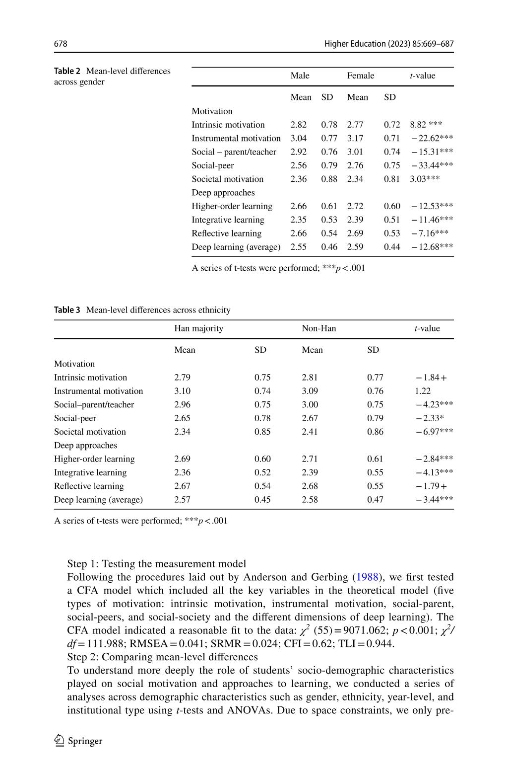 Abstract:Mainstream research in higher education and motivation has shown the importance of intrinsic and instrumental motivation on student learning and achievement. However, the role of social motivation has been relatively neglected. This gap is especially salient in a collectivist cultural context where social factors play a critical role. Drawing on a nationally representative sample of Chinese college students (n = 67,182), this study investigated how social motivation towards (a) parents and teachers, (b) peers, and (c) the broader society are associated with deep approaches to learning including higher-order, integrative, and reflective learning. Structural equation modelling was used to analyze the data with the different types of social motivation posited as predictors of deep approaches to learning. Confirming prior research, the results showed that students with higher intrinsic and instrumental motivation were more likely to use deep approaches learning. More interestingly, students who had higher levels of social motivation directed towards parents/teachers, peers, and the broader society were also more likely to engage in deep approaches to learning. Furthermore, we also found significant mean-level differences in social motivation and deep approaches to learning for students of different genders, ethnicity, socioeconomic status, year levels, and institutional types. These findings demonstrate the importance of taking students’ diverse socio-demographic and institutional backgrounds into account. This article advocated for the importance of exploring social motivation to develop a more nuanced understanding of college students’ motivation and learning in a collectivist context.